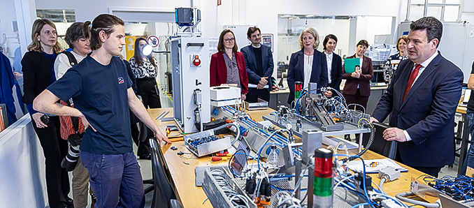 „Wir werden weiterhin flexible Arbeitszeitmodelle für die individuelle Vereinbarkeit von Familie, Freizeit und Arbeitsleben anbieten und die Frauenförderung weiter ausbauen“, so Michaela Hettinger, SMA Personalleiterin. „Wir setzen auch auf unsere besondere Unternehmenskultur mit engagierten Mitarbeitenden, die die Unternehmenswerte Vertrauen, Leistung und Teamgeist täglich leben. Unser Fokus liegt künftig noch stärker auf der Förderung junger Frauen bei Praktika, Ausbildungs- und Studienprogrammen und der Stärkung von Frauen in Führungspositionen. 30 Prozent Frauenanteil im Unternehmen weltweit bis 2030 sind unser Ziel.“ Bundesarbeitsminister Hubertus Heil, zeigte sich bei einem Rundgang durch die SMA Entwicklungsfertigung, dem Besuch der Ausbildungswerkstatt und Gesprächen mit Mitarbeitenden beeindruckt von der Unternehmenskultur. Er freute sich, engagierte gute Aus- und Weiterbildung in der Praxis zu erleben.