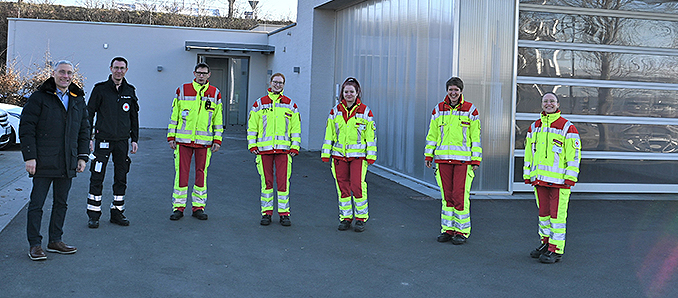 Geschäftsführer Stefan Bott, Rettungsdienstleiter Steffen Diegmüller, und die Rettungsdienstler freuen sich über mehr Platz in der Unterkunft auch für die vier weiblichen Nachwuchskräfte, die derzeit in der Ausbildung auf ihren Einsatz vorbereitet werden. Foto: privat