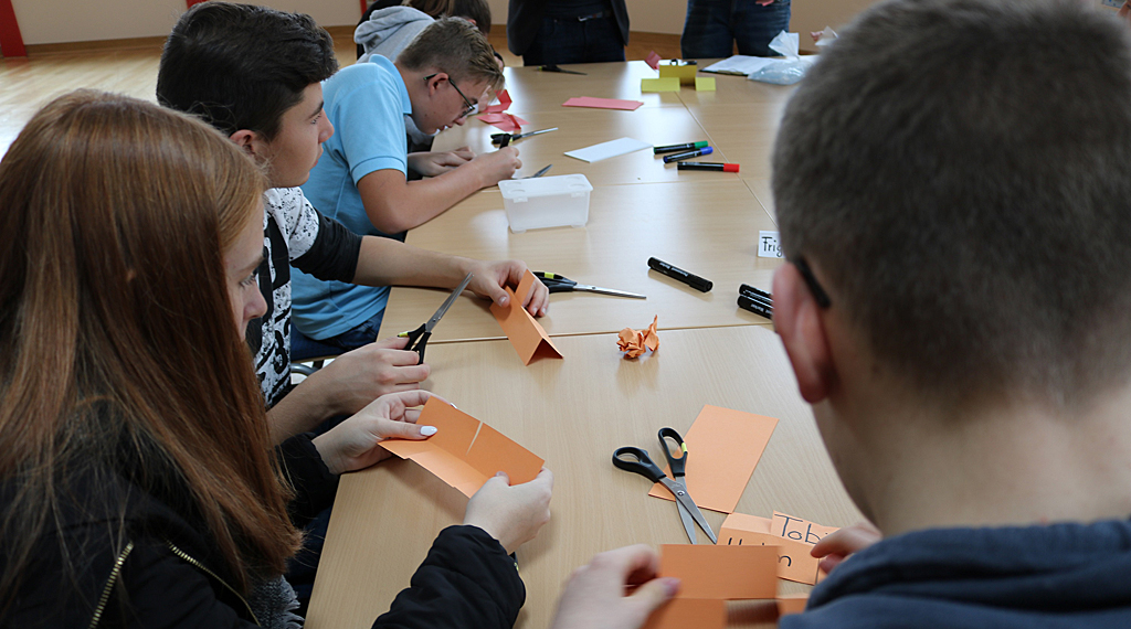„MINT“, seinerzeit speziell entwickelt, um Mädchen für die Berufe der naturwissenschaftlichen und technischen Gebiete zu begeistern, ist längst ein Thema für alle Schülerinnen und Schüler geworden: Jungs und Mädchen sitzen zu gleichen Teilen in den AGs, freuen sich die Organisatoren, die gespannt das Kick-Off in ihrer Schule verfolgten. Bei der Frage nach den benötigten Kompetenzen beispielsweise sollten die Schülerinnen und Schüler sowie die Lehrkräfte ein Namensschild nach einer bestimmten Vorgabe schneiden und falten: Ein hoher Anspruch an das logische und räumliche Denken, der gar nicht so leicht zu erfüllen war, wie es am Anfang aussah. Auch welche Wörter und Berufe zu den einzelnen MINT-Gebieten zählten, war gar nicht so einfach zu ermitteln: Wer oder was ist ein Geomatiker? Was wollen uns die Zahlen 0110101 sagen? Wissen, Kombinationsgabe, Kreativität und Teamwork waren da gefragt – beste Voraussetzungen auch für eine spätere Berufstätigkeit im MINT-Bereich. Und davon träumen wohl einige der Schülerinnen und Schüler der AvH: Arzt, Ingenieur, Geologe standen unter anderem auf der langen Liste der Berufswünsche, die die jungen Leute bei einer Umfrage zu Beginn des Kick-Offs angegeben hatten. Viele gaben aber auch an, noch gar nicht genau zu wissen, welchen Beruf sie später ausüben wollten – auch zu diesen Fragen versprachen sich die Schülerinnen und Schüler Informationen. Zu Recht, wie das Team von „I am MINT“ bestätigte. „Ihr sollt einen Eindruck bekommen, von den Möglichkeiten, die sich euch bieten – Ausbildungs- und Duale Studienplätze in der Region sind einige davon.“ +++ ak