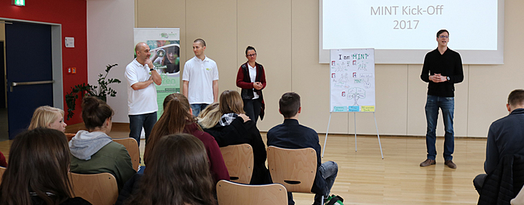 „MINT“, seinerzeit speziell entwickelt, um Mädchen für die Berufe der naturwissenschaftlichen und technischen Gebiete zu begeistern, ist längst ein Thema für alle Schülerinnen und Schüler geworden: Jungs und Mädchen sitzen zu gleichen Teilen in den AGs, freuen sich die Organisatoren, die gespannt das Kick-Off in ihrer Schule verfolgten. Bei der Frage nach den benötigten Kompetenzen beispielsweise sollten die Schülerinnen und Schüler sowie die Lehrkräfte ein Namensschild nach einer bestimmten Vorgabe schneiden und falten: Ein hoher Anspruch an das logische und räumliche Denken, der gar nicht so leicht zu erfüllen war, wie es am Anfang aussah. Auch welche Wörter und Berufe zu den einzelnen MINT-Gebieten zählten, war gar nicht so einfach zu ermitteln: Wer oder was ist ein Geomatiker? Was wollen uns die Zahlen 0110101 sagen? Wissen, Kombinationsgabe, Kreativität und Teamwork waren da gefragt – beste Voraussetzungen auch für eine spätere Berufstätigkeit im MINT-Bereich. Und davon träumen wohl einige der Schülerinnen und Schüler der AvH: Arzt, Ingenieur, Geologe standen unter anderem auf der langen Liste der Berufswünsche, die die jungen Leute bei einer Umfrage zu Beginn des Kick-Offs angegeben hatten. Viele gaben aber auch an, noch gar nicht genau zu wissen, welchen Beruf sie später ausüben wollten – auch zu diesen Fragen versprachen sich die Schülerinnen und Schüler Informationen. Zu Recht, wie das Team von „I am MINT“ bestätigte. „Ihr sollt einen Eindruck bekommen, von den Möglichkeiten, die sich euch bieten – Ausbildungs- und Duale Studienplätze in der Region sind einige davon.“ +++ ak