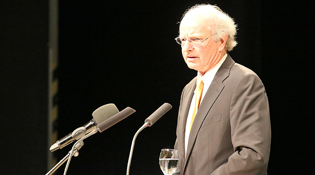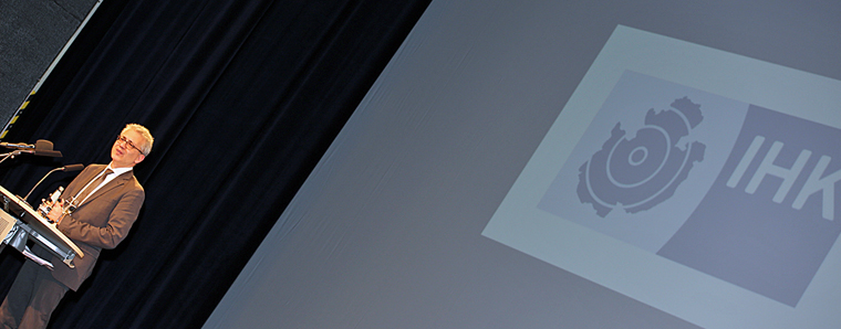 IHK-Präsident Bernhard Juchheim dankte Tarek Al-Wazir für die reibungslose Zusammenarbeit der Schwarz-Grünen Koalition und ließ das turbulente und aus seiner Sicht insgesamt erfolgreiche Wirtschaftsjahr 2014 Revue passieren. Neben seinem Dank an die Unternehmer ging Juchheim auf politische Entscheidungen ein: „Die Rentenreform und der Mindestlohn sind nur zwei kleine Beispiele in einer langen Liste, mit der sich die Politik auf Bundesebene im Jahr 2014 von der Wirtschaft entfernt hat.“ Ob Zeitarbeit, Werkverträge oder Frauenquote: Statt der Eigenverantwortung der Unternehmen zu vertrauen, werde auf Reglementierungen gesetzt. Juchheim forderte unter anderem eine faire und transparente Form befristeter Arbeitsverträge und Zeitarbeit. Zudem müsse die Regelungsdichte in den Unternehmen und in der Gesellschaft zurückgefahren werden.