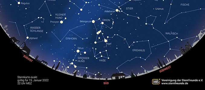 Blickt man gegen 22 Uhr nach Südosten, so sieht man dort das Sternbild Orion mit seinen drei markanten Gürtelsternen und den beiden Hauptsternen, die rötlich schimmernde Beteigeuze und den bläulich funkelnden Rigel. Fast im Zenit strahlt mit der gelblich schimmernden Kapella, dem Hauptstern im Sternbild Fuhrmann, ein weiterer Stern, der zusammen mit Rigel (Orion), Pollux (Zwillinge), Prokyon (Kleiner Hund), Sirius (Großer Hund) und Aldebaran (Stier) das sogenannte Wintersechseck bildet. Sirius ist hierbei der hellste Stern des Sternhimmels. Überhaupt ist der Januarhimmel reich an hellen Sternen und auffälligen Objekten, die auch schon mit bloßem Auge sichtbar sind und im Fernglas oder Teleskop ihre Schönheit offenbaren. Dazu gehört etwa der Orion-Nebel unterhalb des linken Gürtelsterns des Orion oder das Siebengestirn (Plejaden, ein sogenannter offener Sternhaufen) im Sternbild Stier, das wie eine Miniversion des Großen Wagens aussieht.