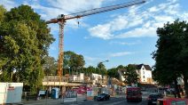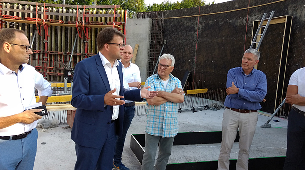 Die Begehungsteilnehmer konnten sich vom Fortschritt der Bauarbeiten überzeugen. Investor Reinhold Werner und Architekt Manfred Reith erläuterten die weiteren Schritte der Großbaustelle, bevor Ende des Jahres der Rohbau fertiggestellt und bis zum Herbst 2019 das Gebäude in Betrieb gehen soll, in dem dann täglich 300 Personen geschult würden. Neben den Räumlichkeiten für die Deutsche Bahn sind weitere Seminarräume sowie die Einrichtung eines kleinen Cafés vorgesehen, konnte der Architekt berichten. Das Untergeschoss beinhalte zudem eine Parkfläche. Das Gebäude mit einer Bruttogeschossfläche von etwa 7.000 qm werde überwiegend eine Lochfassade mit Putz haben. Der spätere Hauptzugang zum Gebäude soll über die Esperantostraße erfolgen. Investor Werner lobte die Kommunalpolitik für die Unterstützung der Projektpläne und für die zügige Bereitstellung des rechtlichen Rahmens für den Bau.