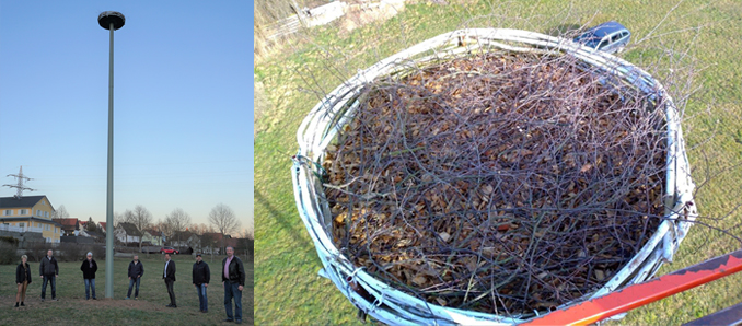Nachdem die Standortfrage geklärt war, ging alles Hand in Hand: Von der Oberen Naturschutzbehörde des Regierungspräsidiums in Kassel wurde der Edelstahl-Nistkorb gestellt. Dieser wurde sodann von den beiden Ortsbeiratsmitgliedern Alfons Schwab und Ralf Schädel zur Befestigung am Masten vorbereitet sowie vorab mit Weidengeflecht „wohnlich“ ausgekleidet. Den insgesamt rund 14 Meter langen Metallmast steuerte die OsthessenNetz GmbH bei.