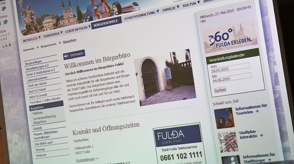 Fulda. Heute Vormittag stellten im Fuldaer Stadtschloss die Leiterin des Bürgerbüros Erika Glückler und Uli Schreiner, im Beisein von Oberbürgermeister Möller (CDU), die Weiterentwicklungen des städtischen Internetauftrittes im Bereich Bürgerservice vor. „Durch das jetzt ins Leben gerufene Call-Center im Bürgerbüro sind wir in der Lage die vielen telefonischen Anfragen direkt und ohne Umwege zu beantworten. Dies ist durch den direkten Zugriff auf eine Datenbank möglich“, so Gerhard Möller.