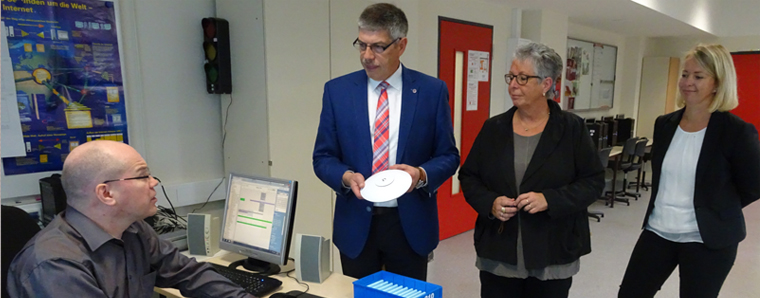 Konrektor Marco Allendorf (li.) erläutert Landrat Görig die Funktionsweise der modernen WLAN-Router. Mit dabei Schulleiterin Helga Stock (2. v. r.) und ihre Stellvertreterin Anne Christ. Foto: Berthold Habermehl