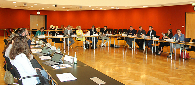 : „Unser Wirtschaftsstandort befindet sich bereits mitten im Wandel, das ist alles andere als abstrakt“: Wirtschaftsdezernent Winfried Ottmann bei einer Sitzung der Steuerungsgruppe des „Reallabors Main-Kinzig-Kreis“ (Stirnseite, Zweiter von links), gemeinsam mit Claudia Wesner (Hessisches Ministerium für Arbeit, Integration, Jugend und Soziales), Dr. Christa Larsen und Marcel Schwartz (je Goethe-Universität, rechts daneben).