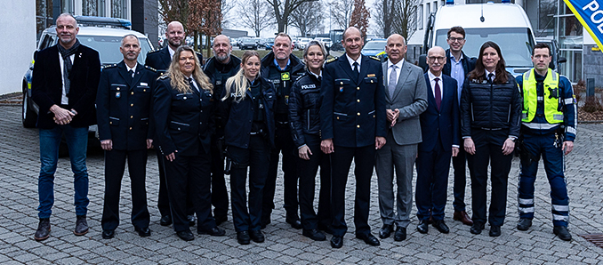 Innenminister Roman Poseck und Polizeipräsident Michael Tegethoff mit Mitarbeiterinnen und Mitarbeitern des Polizeipräsidiums Osthessen. Foto: PPOH