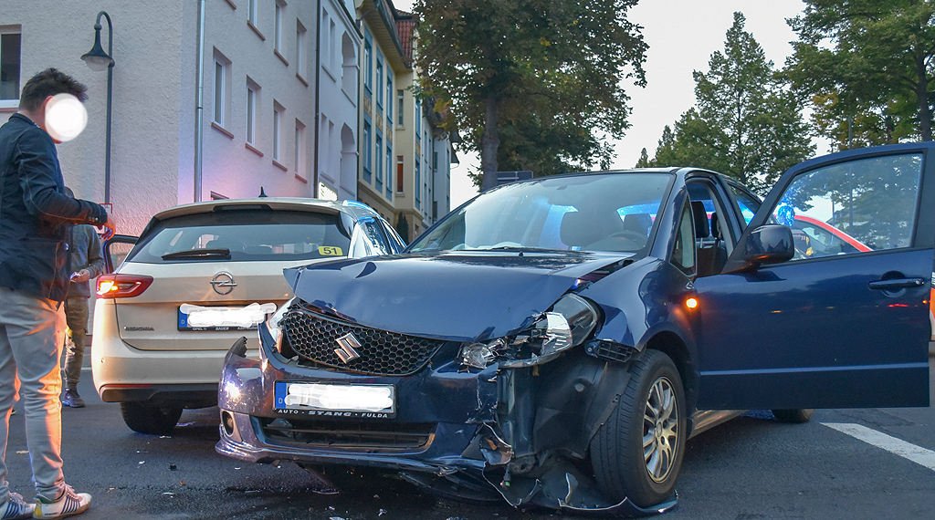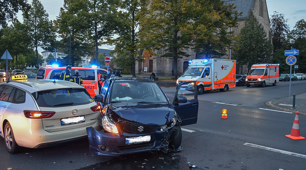 In Fuldas Innenstadt hat sich am Freitagabend ein Verkehrsunfall ereignet, bei dem vier Personen verletzt wurden. Der 43-jährige Fahrer eines Taxis wollte mit seinem Insignia von der Sturmiusstraße kommend die Lindenstraße geradeaus in Richtung Rabanusstraße überqueren. Hierbei beachtete er jedoch nicht die Vorfahrt eines von rechts kommenden Pkw Suzuki, der im rechten Fahrstreifen der Lindenstraße in Richtung Bahnhofstraße fuhr und von einer 20-jährigen Frau aus Fulda geführt wurde. Der Suzuki stieß frontal in die rechte Seite des Taxis im hinteren Bereich. Hierdurch wurden sowohl die Fahrerin des Suzuki, deren 43-jährige Beifahrerin und auch der Fahrgast des Taxis leicht verletzt, bei dem es sich um einen 49 Jahre alten Mann aus der Schweiz handelte. Die verletzten Personen wurden vorsorglich mit Rettungswagen in ein Krankenhaus gebracht. Der Suzuki der Fuldaerin war nicht mehr fahrbereit und musste abgeschleppt werden. Der Gesamtschaden wird auf rund 20.000 Euro geschätzt. +++