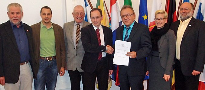Grebenhain. Für Landrat Erich Pipa und den Bürgermeister der Vogelsberggemeinde Grebenhain, Sebastian Stang, war es ein besonderer Moment. Denn mit der Vereinbarung zur „interkommunalen Zusammenarbeit“ kann der Ortsteil Volkartshain ab sofort mit seinen 45 Haushalten über die Kreisgrenze hinweg an das Glasfasernetz angeschlossen werden. Gemeinsam mit dem Kreisbeigeordneten Matthias Zach und dem Ersten Beigeordneten der Gemeinde Grebenhain, Thomas Einig, unterzeichneten sie jetzt das entsprechende Papier und schon in wenigen Tagen sollen die Arbeiten beginnen. Konkret geht es um eine Datenleitung vom Birsteiner Ortsteil Völzberg zum gut 1.200 Meter entfernten Nachbarn.