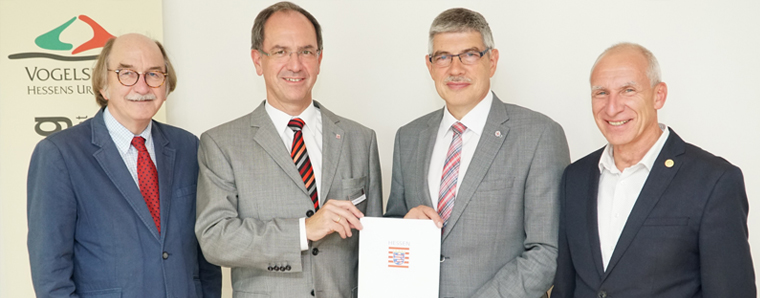 Bescheidübergabe für eine sinnvolle Interkommunale Zusammenarbeit (v.l.): Rainer-Hans Vollmöller (Bürgermeister Lauterbach), Dr. Christoph Ullrich (Regierungspräsident), Manfred Görig (Landrat) und Heinrich Muhl (Stadtrat Alsfeld). Foto: © RP Gießen