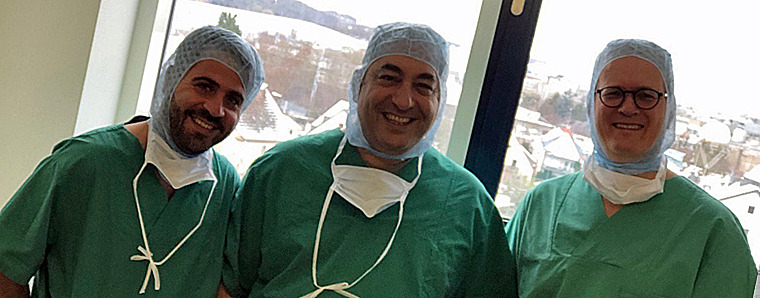 Dr. Hölper mit Prof. Itshayek (Mitte) und Kollege im OP des Herz-Jesu-Krankenhauses in Fulda nach gelun-