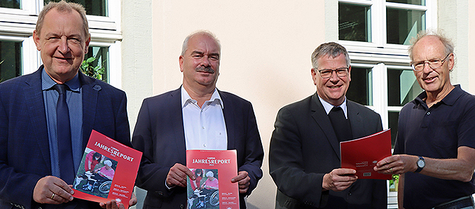 Der Caritas-Jahresreport 2022 ist erschienen: Vor dem Caritas-Haus übergaben Diözesan-Caritasdirektor Dr. Markus Juch, Vorstandsmitglied Ansgar Erb sowie der redaktionell für den Report verantwortliche Caritas-Pressesprecher Dr. Christian Scharf die ersten Druckexemplare an Generalvikar Prälat Christof Steinert als dem Aufsichtsratsvorsitzenden des Caritasverbandes für die Diözese Fulda.