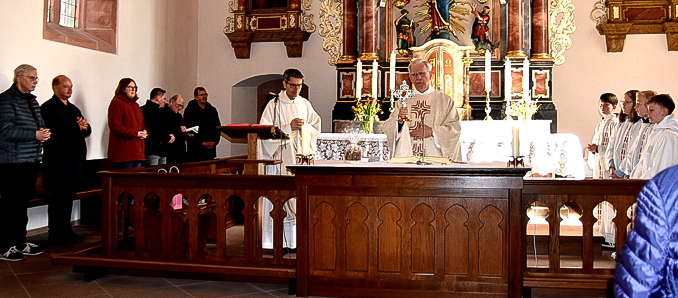 Die Wallfahrtskirche auf dem Gehilfersberg bei Rasdorf hat wieder eine große Anziehungskraft. Bei der Eröffnung des Wallfahrtsjahres war sie übervoll. Traditionell wurde am Ostermontag das Wallfahrtsjahr 2023 in der Wallfahrtskirche zu den Heiligen 14 Nothelfern auf dem Gehilfersberg bei Rasdorf eröffnet. Die Menschen aus dem Hünfeld und Fuldaer Land sowie aus dem Geisaer Amt und Raum Hersfeld waren so zahlreich gekommen, dass einige die Eucharistiefeier über die Außenlautsprecher mitfeiern mussten.