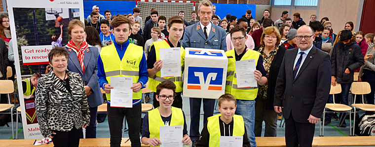 Die neuen Schulsanitäter in Warnwesten (links hinten: Nikifor Gjorgiev, Lucas + Gabriel Schröter, vorne: Florian Heurich, Niklas Hacker – es fehlt Leonie Günther) zusammen mit der Malteser SSD-Referentin Brigitta Brähler-Fischer (2. Von links), Rektorin Gabriele Schmitt-Lauer(links), Lehrerin Karin Hollmann(vorne 2. von rechts), die die Leitung des SSD übernimmt, Raiffeisen-Vorstandsmitglied Hubertus Semmler(1. von rechts), Malteser-Präsident Dr. Constantin von Brandenstein-Zeppelin(4. von rechts), Schülern und Lehrern der Johannes-Hack-Schule.