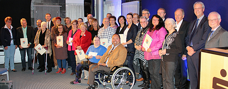 Feierstunde aus Anlass des Jubiläums „10 Jahre Familienbündnis“. Unser Foto zeigt die Gruppe der Geehrten aus dem Wettbewerb „Gute Beispiele im Ehrenamt“. Der Vertreter des Bundesfamilienministeriums, Dr. Thomas Metker (Zweiter von rechts), der die Glückwünsche von Familienministerin Dr. Franziska Giffey überbrachte und die Festrede hielt, zeigte sich sehr beeindruckt von den Aktivitäten im Vogelsbergkreis. Foto: Erich Ruhl-Bady