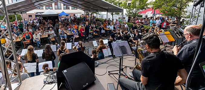 Insbesondere am Sonntag sorgten blauer Himmel, wenige weiße Wolken und strahlender Sonnenschein für beste Rahmenbedingungen. Bereits um kurz nach zehn Uhr zeigte das Sinfonische Blasorchester des Musikvereins „Viktoria Altenmittlau“ ganz in Rot-Schwarz und mit Hingabe sein musikalisches Können. Anschließend bezauberte Singer-Songwriterin Danny June Smith die Zuhörerinnen und Zuhörer mit Oldies, eigenen Titeln, Country, Pop und Folk. Der Soloauftritt mit Gitarre kam so gut an, dass die gebürtige Langenselbolderin sich gern zu einer Zugabe bewegen ließ.