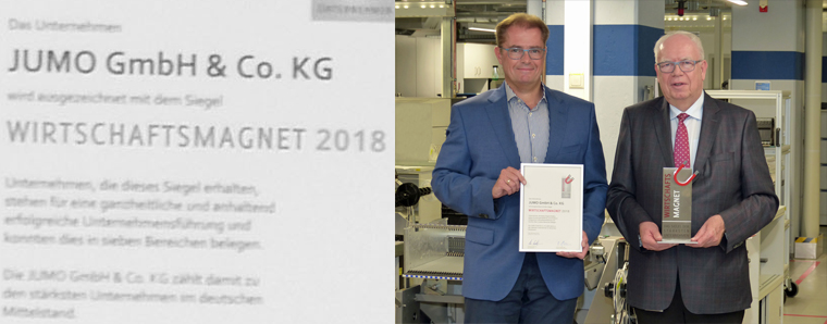 Die in Fulda ansässige JUMO GmbH & Co. KG ist ein „Wirtschaftsmagnet 2018“. Das „Siegel der stärksten Unternehmen“ wurde vom Unternehmensberater und Autor Christian Kalkbrenner ins Leben gerufen, um Mittelständlern für ihre ganzheitliche und anhaltend erfolgreiche Arbeit eine besondere Würdigung zukommen zu lassen. In diesem Jahr wurde das Siegel bundesweit 35-mal vergeben.