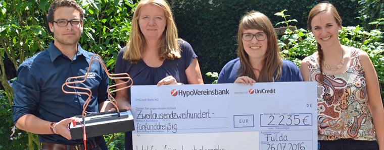 Der symbolische Spendenscheck wurde zusammen mit dem „heißen Draht“ in der Frankfurter Vereinseinrichtung an Karin Reinhold-Kranz, die Vorstandsvorsitzende des Vereins überreicht, die sich sehr beeindruckt von der Spende und dem damit verbundenen Engagement der Auszubildenden zeigte. Der Verein „Hilfe für krebskranke Kinder Frankfurt e.V.“ betreibt unter anderem ein Zentrum, das Familien mit krebskranken sowie anderen lebensbedrohlich erkrankten Kindern und Jugendlichen als Wohnort auf Zeit, Treffpunkt, Entspannungsort und Informationsstelle dient. Darüber hinaus kümmert sich der Verein um die Ausstattung der Kinderkrebsstation im dortigen Klinikum mit Spielsachen, Bastelmaterial und Netbooks. +++ fuldainfo