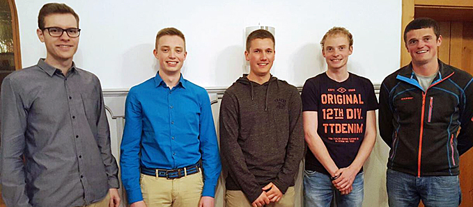 Kreisvorsitzender Julian Vogt, der neue Vorsitzende der Jungen Union Poppenhausen, Julian Link, sein Stellvertreter Roman Burkhart sowie deren beiden Vorgänger Jan-Niklas Heller und Gabriel Hauser. (v.l.)