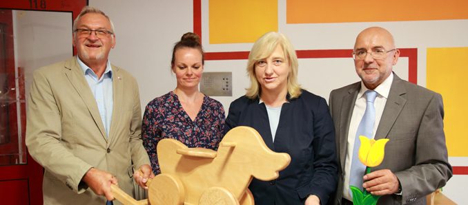 Ihren Besuch in Fulda nutzte die Ministerin außerdem, um die neu eingerichtete Kreativwerkstatt in der Anstalt zu besichtigen. „Dieses besondere Beschäftigungsprojekt wurde Anfang des Jahres begonnen. Hier werden kreative, niedrigschwellige Angebote vorgehalten, die den Bedürfnissen des Einzelnen gerecht werden. Auch das Bewusstsein für Gesundheit, Bewegung und Ernährung werden mit entsprechenden Veranstaltungen geschärft“, erläutert Winfried Michel. „Das Angebot der Kreativwerkstatt richtet sich an Inhaftierte mit besonderem Unterstützungsbedarf. Zum Personenkreis zählen Menschen, die aus unterschiedlichen Gründen nicht in der Arbeitswelt integriert sind. Dabei stehen kognitive Schwächen, psychische oder physische Einschränkungen im Vordergrund. Die Kreativwerkstatt bietet den Gefangenen die Möglichkeit, sich eine Tagesstruktur aufzubauen, die ihren aktuellen Fertigkeiten entspricht“, so Michel weiter. Winfried Michel und seine Mitarbeiter übergaben am Ende des Besuches Justizministerin Kühne-Hörmann noch ein Geschenk, welches von Inhaftierten gefertigt worden war. „In dieser kleinen Holzente liegen viel Energie und viele Emotionen. Das Spielzeug kann für einen guten Zweck, zum Beispiel in einem Kinderzeugenzimmer eingesetzt werden und Kindern, die Opfer oder Zeuge einer Straftat geworden sind, Mut geben, das Verfahren zu bewältigen“, so Winfried Michel.