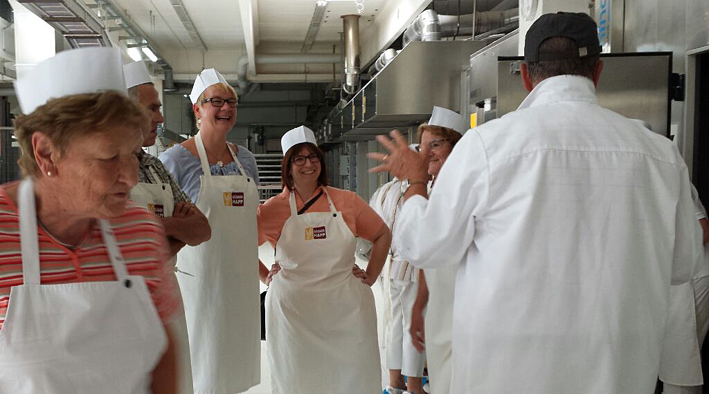 Kalbach. Der Ausflug der CDU Kalbach startete mit einem gemütlichen Kaffeetrinken mit herzhaften und süßen Schlemmereien in der Bäckerei Happ in Neuhof. Anschließend erhielten wir eine Führung vom Seniorunternehmerehepaar Franz-Karl und Anita Happ durch den Produktionsbetrieb und erfuhren mehr über das Unternehmen Happ. Bei der Bäckerei Happ handelt es sich um ein Familienunternehmen in 3. Generation. 1946 gründeten Josef und Paula Weber in der Veitsteinbacher Straße in Mittelkalbach die Bäckerei Weber. 1953 zieht die Bäckerei an den heutigen Standort nach Neuhof in die Fuldaer Straße und bezog eine Backstube von 150 m².