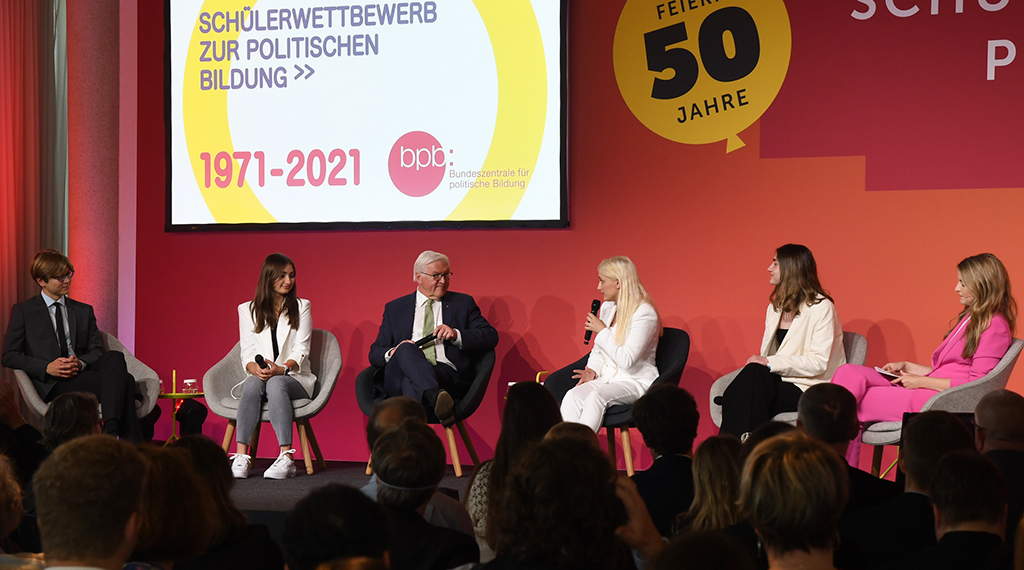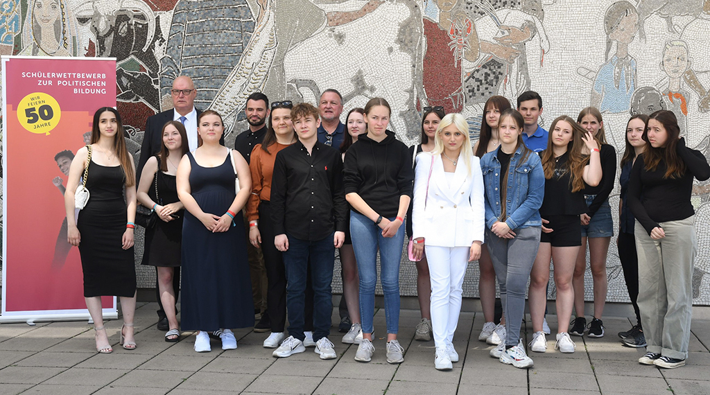 Prominenter Gast anlässlich des 50. Geburtstages des Schülerwettbewerbs der Bundeszentrale für politische Bildung (bpb) war Bundespräsident Frank-Walter Steinmeier – und mit von der Partie bei der Festveranstaltung in Berlin war auch eine Schülergruppe der Konrad-Adenauer-Schule Petersberg (KAS). Diese hatte die Reise in die Bundeshauptstadt als ersten Preis beim diesjährigen Wettbewerb der Bundeszentrale gewonnen.
