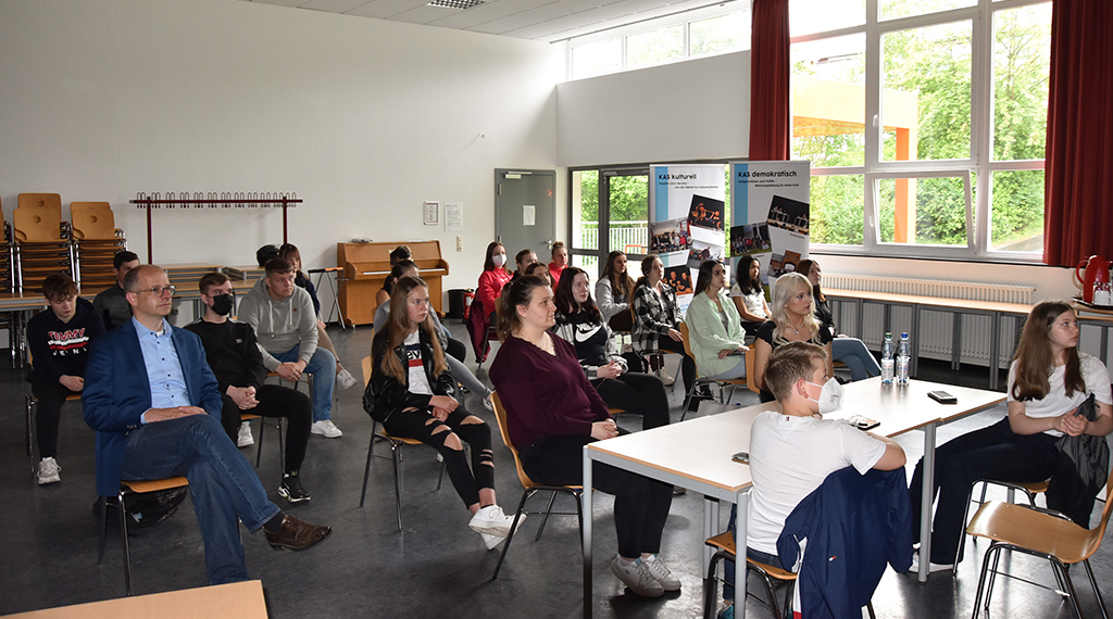 Doch damit nicht genug: KAS-Schülerin Ceren Çagan gehörte zu den vier Schülern, die das Staatsoberhaupt in einem Podiumsgespräch vor mehr als 400 Gästen zu den unterschiedlichsten Themen befragen durften. In dem rund 40-minütigen Gespräch ging es vor allem um die Rolle der jungen Menschen in der Politik und wie sie sich Gehör verschaffen können. Auch aktuelle Themen wie die globale Lage, die Zunahme von extremen Positionen allerorts, die Ausgrenzung von Minderheiten sowie der Weg in die politische Verantwortung kamen ebenfalls zur Sprache. Die 17-jährige Ceren aus Künzell hatte sich in einem aufwändigen Auswahlverfahren für ihren Platz am Podium qualifiziert. Zu Beginn der Veranstaltung gedachte man der Opfer des Mordanschlags auf eine Schulklasse in der Berliner Innenstadt wenige Tage zuvor.