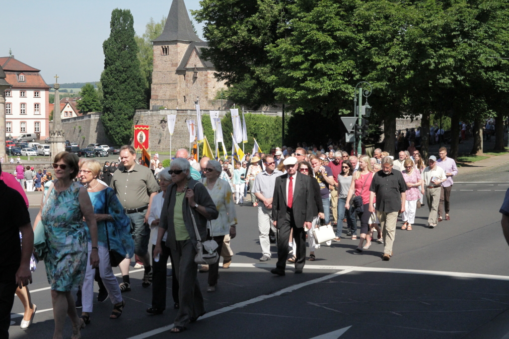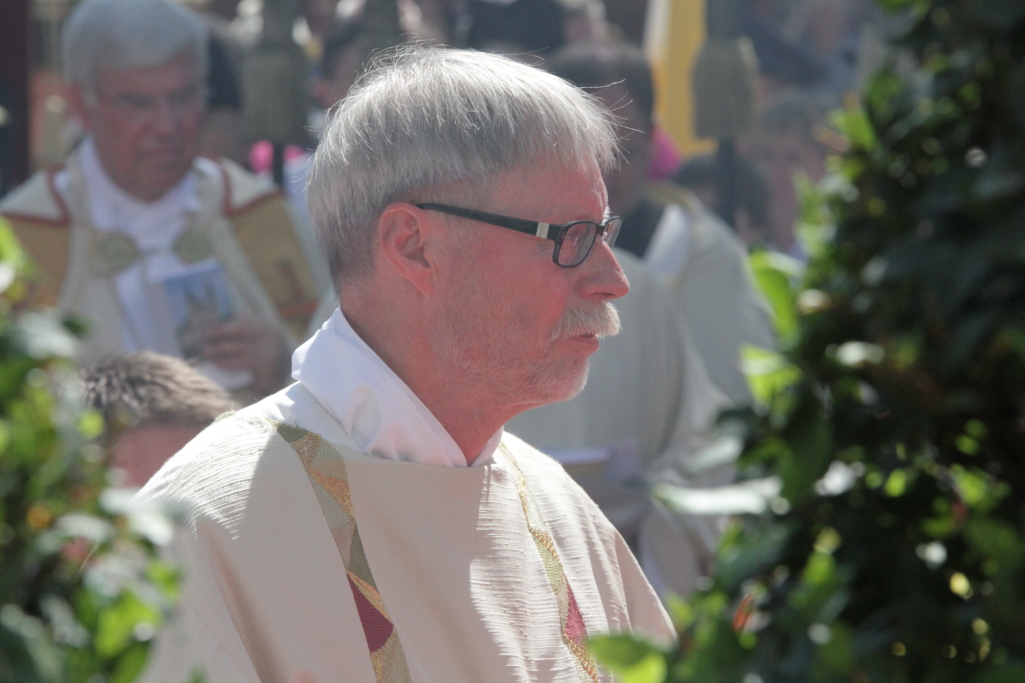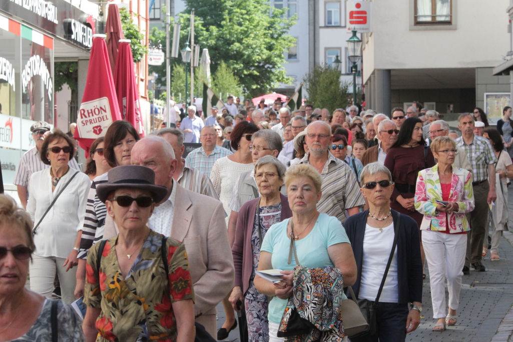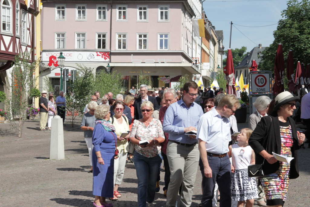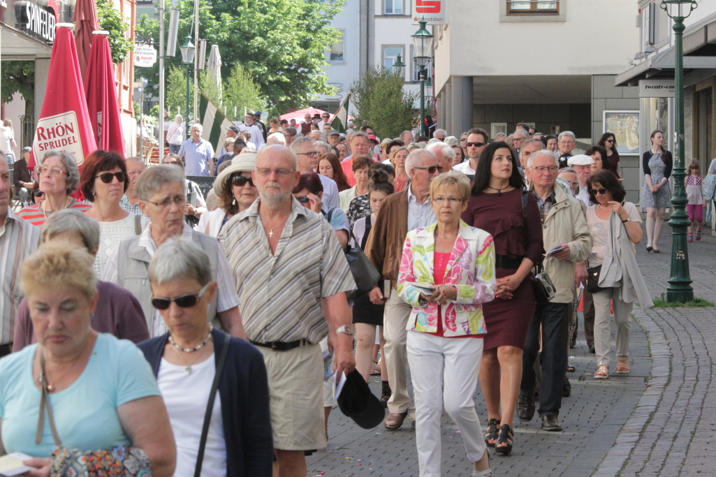 Weil die Kirche zeigen wolle, woraus sie lebt und was sie der Welt zu geben hat, darum feiere sie das Hochfest Fronleichnam unter den Blicken der Öffentlichkeit, stellte der Fuldaer Bischof Heinz Josef Algermissen in seiner Predigt heraus. Fronleichnam sei ein Ergänzungsfest zu Gründonnerstagabend und damit wesentlich auf die Hl. Eucharistie bezogen. „In der Feier der Eucharistie begegnen wir dem auferstandenen und in der Kraft seines Geistes gegenwärtigen Christus selbst. Mit dieser Überzeugung steht oder fällt unser christlicher Glaube“, hob der Oberhirte hervor. „Ohne diese Glaubensüberzeugung wäre die Feier der Eucharistie nichts Anderes als Totenkult und damit ein weiterer Ausdruck unserer Trauer über die Macht des Todes in der heutigen Welt.“ In der Feier der Eucharistie begegne den Gläubigen der Auferstandene selbst und sei in seinem Geist gegenwärtig.