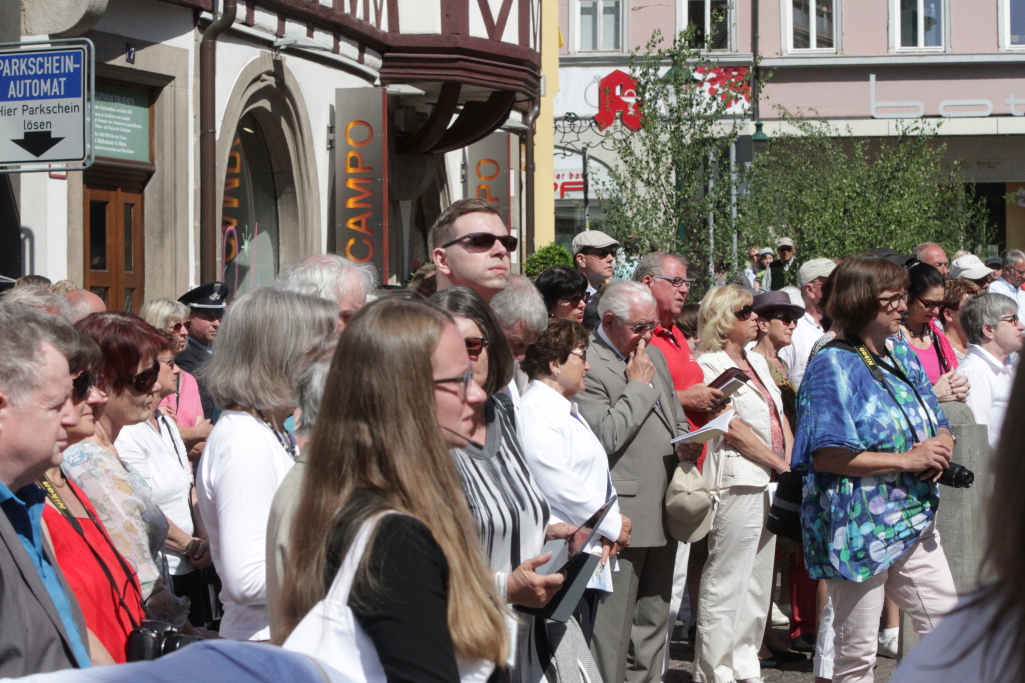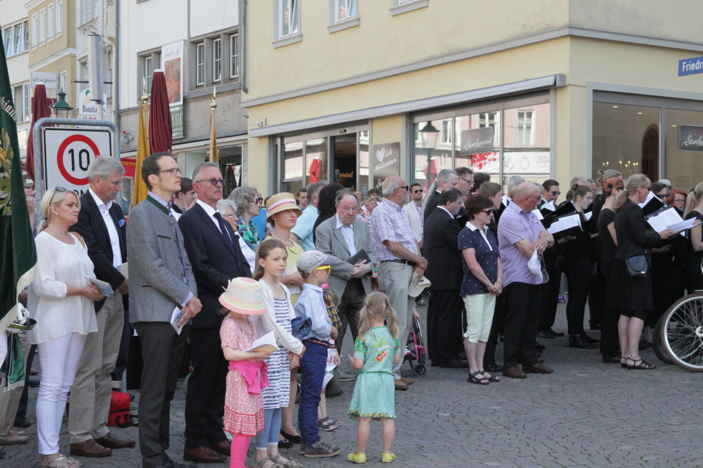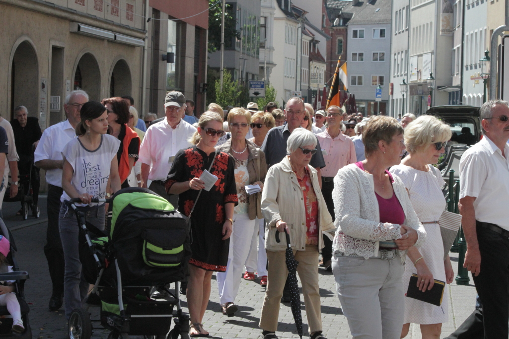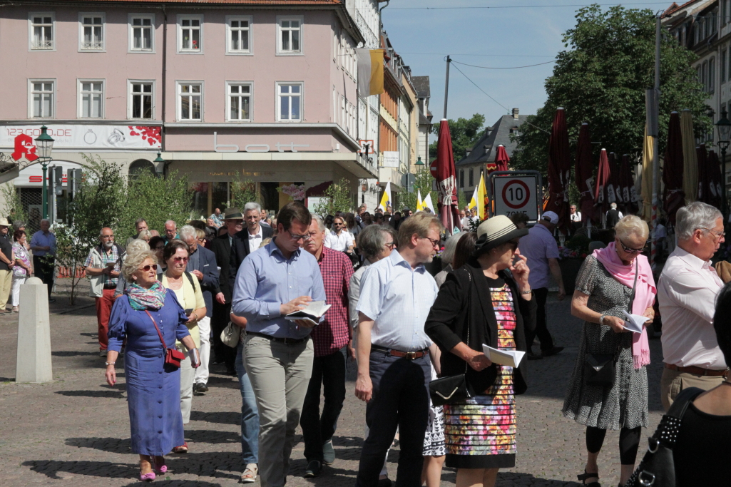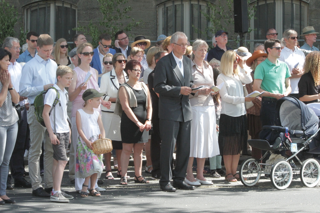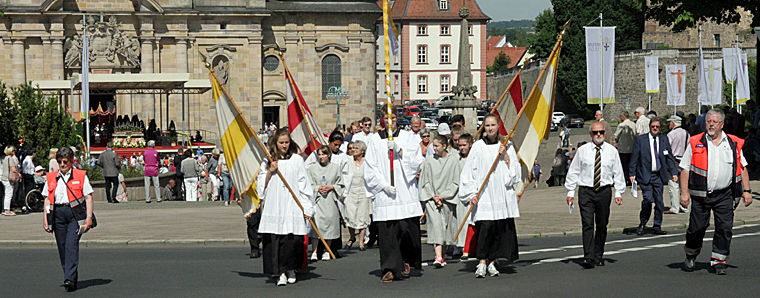 Weil die Kirche zeigen wolle, woraus sie lebt und was sie der Welt zu geben hat, darum feiere sie das Hochfest Fronleichnam unter den Blicken der Öffentlichkeit, stellte der Fuldaer Bischof Heinz Josef Algermissen in seiner Predigt heraus. Fronleichnam sei ein Ergänzungsfest zu Gründonnerstagabend und damit wesentlich auf die Hl. Eucharistie bezogen. „In der Feier der Eucharistie begegnen wir dem auferstandenen und in der Kraft seines Geistes gegenwärtigen Christus selbst. Mit dieser Überzeugung steht oder fällt unser christlicher Glaube“, hob der Oberhirte hervor. „Ohne diese Glaubensüberzeugung wäre die Feier der Eucharistie nichts Anderes als Totenkult und damit ein weiterer Ausdruck unserer Trauer über die Macht des Todes in der heutigen Welt.“ In der Feier der Eucharistie begegne den Gläubigen der Auferstandene selbst und sei in seinem Geist gegenwärtig.