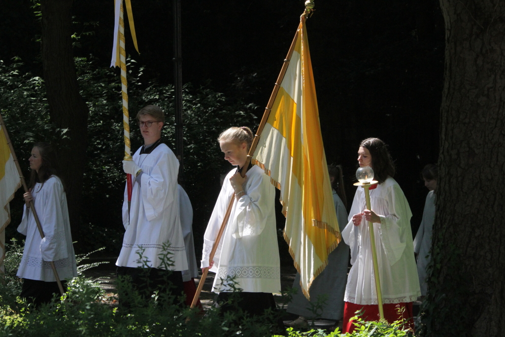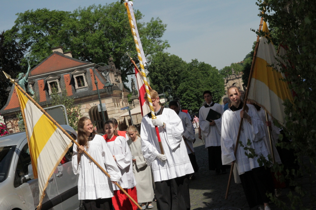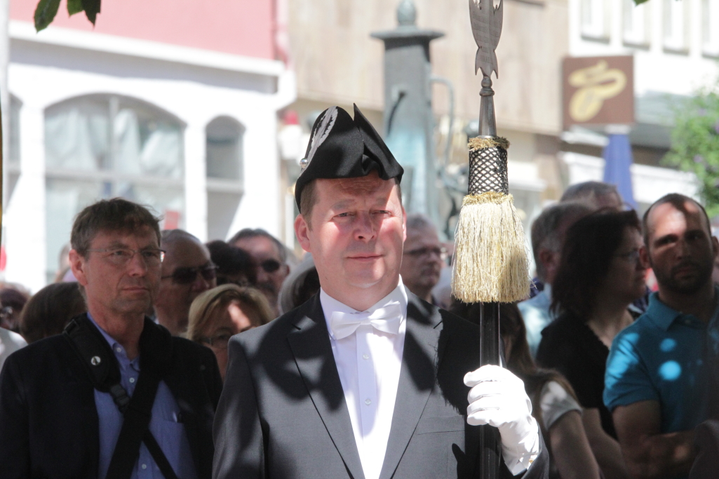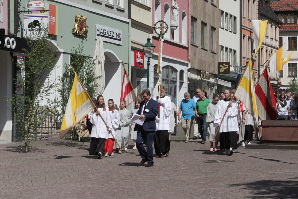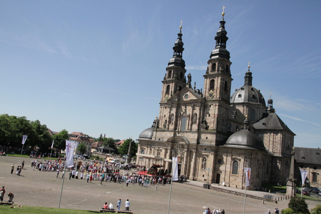 Fulda. Mit festlichen Gottesdiensten und Prozessionen haben am Donnerstag die katholischen Christen das Fronleichnamsfest begangen. Eine der bedeutendsten Fronleichnamsprozessionen in Hessen fand in der Bischofsstadt Fulda statt, wo das Hochfest des Leibes und Blutes Christi seit über 700 Jahren begangen wird. Rund 2.500 Gläubige zogen nach einem feierlichen Pontifikalamt im vollbesetzten Dom bei strahlendem Sonnenschein durch die mit frischem Birkengrün, bunten Blumenteppichen und gelb-weißen Fahnen geschmückte Innenstadt.