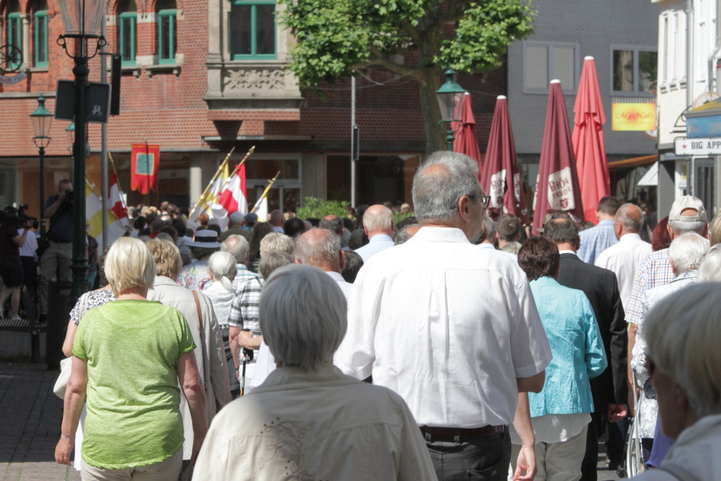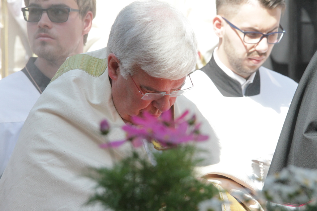 Die Kirche sei im Kern Eucharistie und werde von der Eucharistie her immer wieder neu aufgebaut. „Christus schenkt uns seinen Leib, damit wir selbst Leib Christi werden. In der Eucharistie gehen wir in das über, was wir empfangen. Wir empfangen den Leib Christi, um immer deutlicher und glaubwürdiger den Leib Christi in der Welt darzustellen und zu bilden“, erläuterte der Bischof. Die Eucharistie wirke über den Abschluss der liturgischen Feier hinaus. In der Leibhaftigkeit, die Christi Gegenwart in den eucharistischen Gaben angenommen habe, werde die Kirche von Christus auch weiterhin begleitet. „Er geht sozusagen mit ihr auf ihrem Weg in den Alltag, wie wir es gleich bei der Prozession durch die Straßen unserer Stadt Fulda zeichenhaft darstellen.“ Für Christen höre das Kirche-Sein beim Verlassen des Kirchengebäudes nicht auf, unterstrich Algermissen. „Wenn wir teilnehmen dürfen an der sakramentalen Feier der Selbsthingabe Jesu Christi für uns Menschen, dann sind wir auch gesandt, uns im Alltag des Lebens den Menschen zur Verfügung zu stellen, die unsere Hilfe und Begleitung nötig haben.“ Christen müssten Barmherzigkeit, Gnade und Frieden in eine Welt bringen, wo „man einander fertigmacht“. Der Gottesdienst wolle hinauswirken in die Welt und die Beziehungen der Menschen untereinander verwandeln. Selbstverständlich müssten die Eucharistiefeier und die folgende Prozession mit dem Allerheiligsten Konsequenzen haben zugunsten von Frieden und Gerechtigkeit, Wahrheit und Ehrfurcht vor den anderen. Nach katholischem Verständnis konstituiere die Eucharistie eine Wirklichkeit, die Kirche konstituiere.