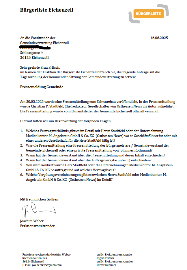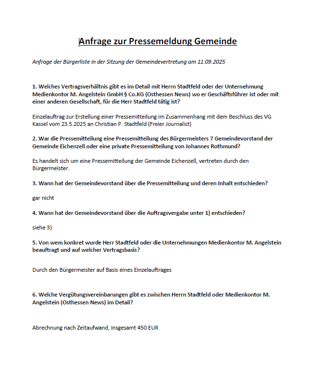 Der Auftrag des Eichenzeller Bürgermeisters an den Chefredakteur von ON zur Erstellung einer Pressemitteilung wirft ernsthafte Fragen auf. Der entstandene Text hätte ebenso gut – und vermutlich sogar überzeugender – direkt vom Bürgermeister selbst verfasst werden können. Daher stellt sich unweigerlich die Frage nach dem „Warum?“.