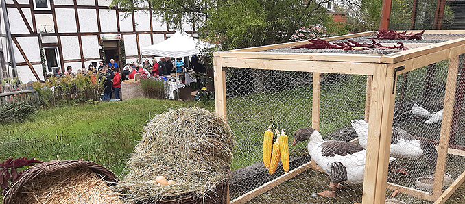 Im Anschluss an die Fürbitten waren alle Besucher zu einem bunten Fest rund um Linde und Pfarrhaus eingeladen, wo es bis in die späten Nachmittagsstunden bei bester Verpflegung Musik, Mundart und handwerkliche Vorführungen zu erleben gab. Im Pfarrhaus zeugte eine Ausstellung von der langen Erntedanktradition des Ortes und die Kinder waren zum Basteln und Schminken eingeladen. „Die vielen engagierten Helfer von Landfrauen, Gemeindekirchenrat und aus den zahlreichen Vereinen machten das 11. Kreiserntedankfest zu einer ganz besonderen Veranstaltung, die - wie auch schon in vergangenen Jahren - die individuellen Stärken des veranstaltenden Dorfes deutlich sichtbar machte! Danke Kieselbach, großartig, was ihr gemeinsam schafft!“, zeigte sich der Landrat im Nachgang des Festes begeistert.