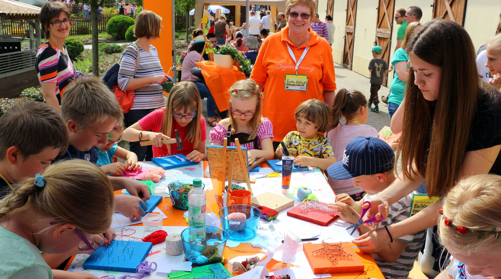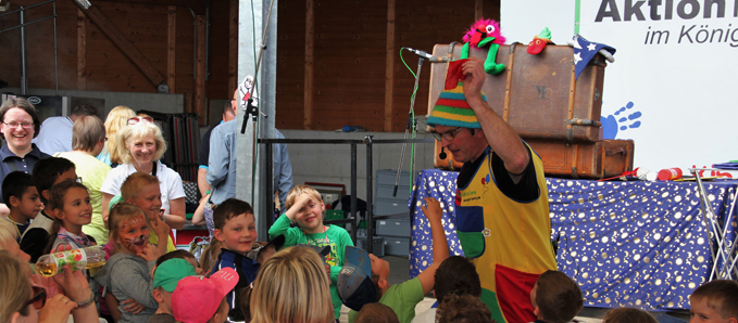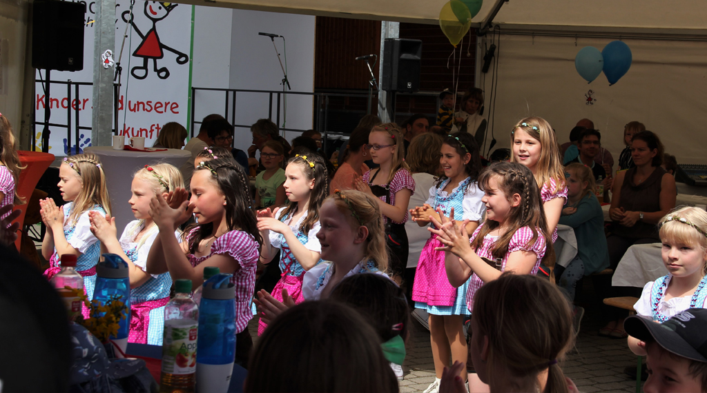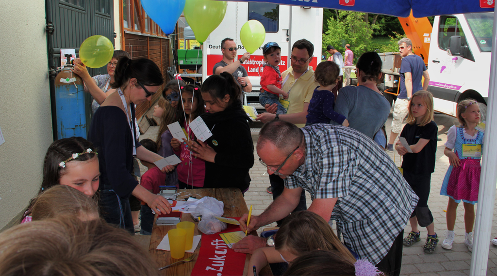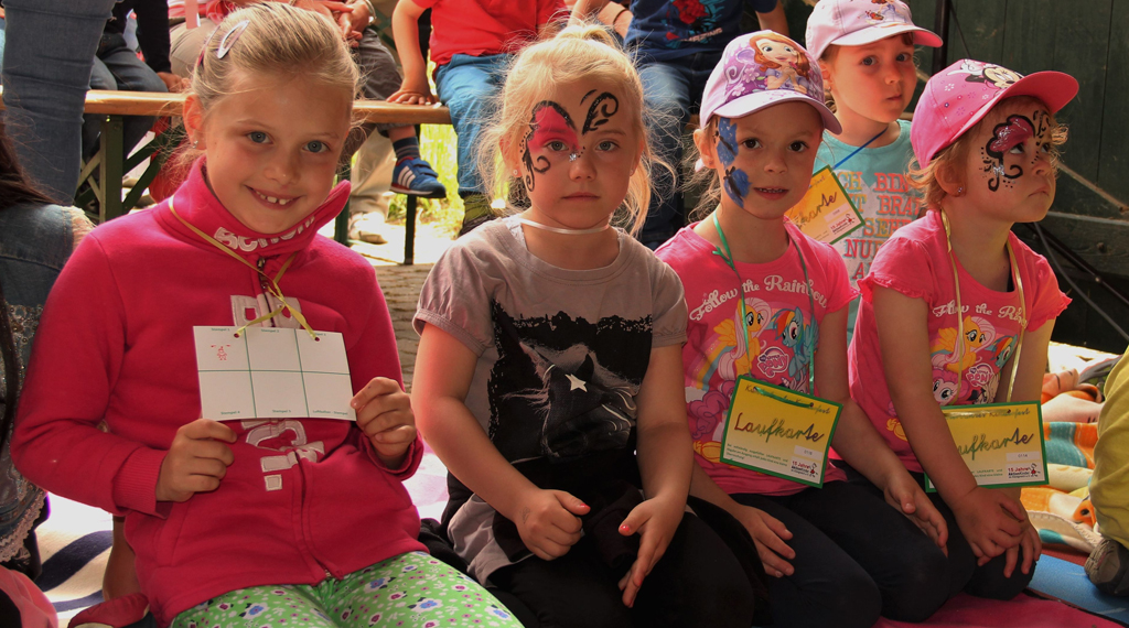 Das Ziel, viele Kinderaugen zum Leuchten zu bringen, wurde voll und ganz erreicht. Dafür sorgten viele von Vereinen und Initiativen organisierte Stände, an denen die kleinen Besucher aktiv werden konnten. Darüber hinaus unterhielt über den ganzen Tag hinweg ein abwechslungsreiches Bühnenprogramm die Gäste, das durch Märchenstunden und das Marionettentheater „Kistenhausen“ im Schafstall des Anwesens abgerundet wurde. Das Besondere: Alle Programmangebote und Aktivitäten waren kostenfrei! Die Kinder erhielten zudem noch Verzehrgutscheine und konnten sich mit dem Besuch mehrerer Aktionsstände eine Trinkflasche „erspielen“. Mit einer ökumenischen Andacht, gestaltet von Pfarrer Holger Biehn und Diakon Carsten Huppmann, wurde das Kinderfest am frühen Abend beendet. Insgesamt kamen fast 2.000 Besucher zu dem Kinderfest. Für die Gestaltung von Plakaten und Flyern waren die Grundschulen Flieden und Rückers verantwortlich: Die Schulkinder malten Plakate nach ihren Vorstellungen; einzelne Motive flossen dann in das Design der Werbemittel ein. Die Schulklassen wurden dafür jeweils mit einem Scheck für die Klassenkasse belohnt.