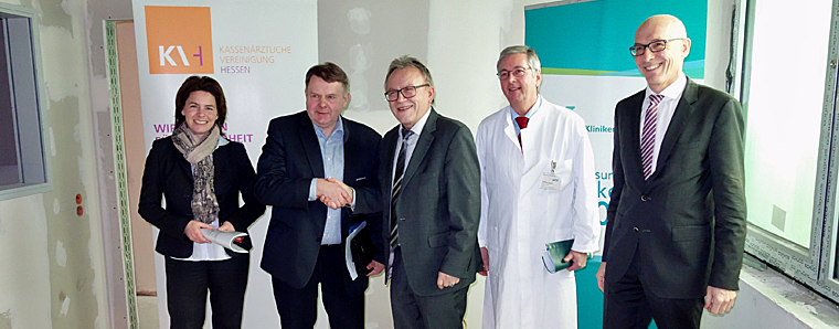 Klinikgeschäftsführer Dieter Bartsch, Chefarzt Dr. med. Hans-Ulrich Rhodius, Landrat Erich Pipa, der stellvertretende Vorstandsvorsitzende der KV Hessen, Dr. Günter Haas, sowie Anna Roth, zuständige Bereichsleiterin Mitgliederservice der KV Hessen. (v.re.)