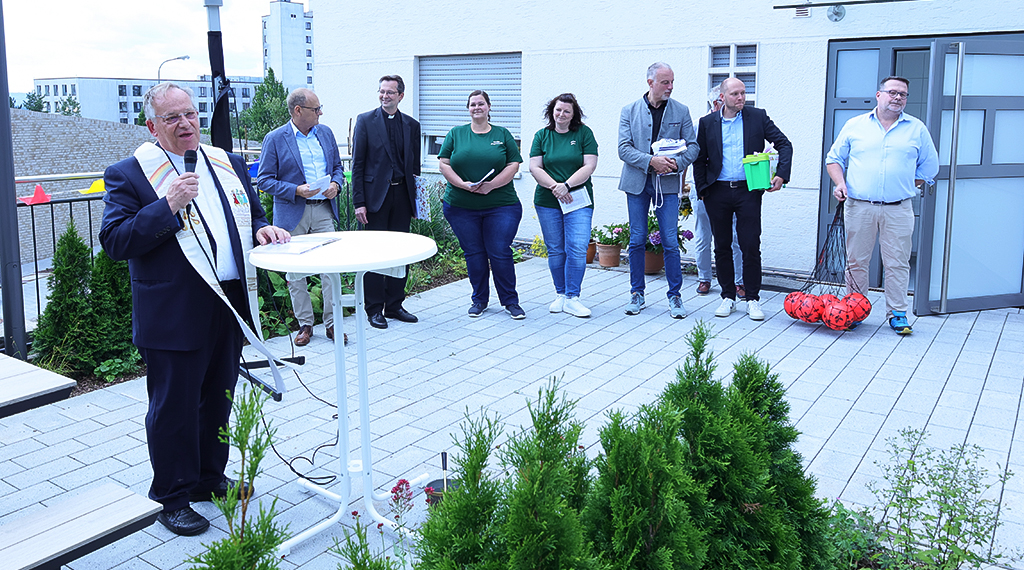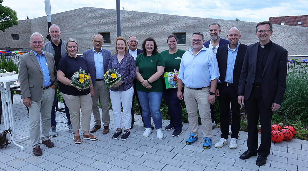 Pfarrer Liebig weiter: „Die Segnung unserer neuen Kita ‚St. Pius‘ ist also kein weiterer Pflichttermin in meinem dicken Terminkalender (gerade jetzt vor den Ferien), kein Alltagsgeschäft und erst recht keine Kleinigkeit. Die Eröffnung der Kita ist etwas Großes und Wichtiges für unsere Pfarrgemeinde und für die Bürgerinnen und Bürger von Ziehers-Süd und darüber hinaus in der ganzen Stadt Fulda“, so Pfarrer Rudolf Liebig in seinen Worten zur Begrüßung. Pfarrer Liebig dankte dem anwesenden Bürgermeister der Stadt Fulda, Dag Wehner, für die Zusammenarbeit, die der Pfarrer der Kirchengemeinde „St. Pius“ am Samstag als eine sehr „spannungsreiche Zusammenarbeit“ hervorhob. Ein weiterer Dank richtete er an die Mitarbeiterinnen und Mitarbeiter seines Dezernats. Nicht zuletzt galt sein Dank dem Architektenbüro Reith Wehner Storch, im Besonderen dem Architekten und Bürogründer Dipl.-Ing. Manfred Reith, dem Architekten und Partner Dipl.-Ing. Max Reith sowie dem Partner und Architekten Dipl.-Ing. & Betriebswirten Stephan Storch für ihr heutiges Kommen sowie ihre Meisterleistung. Von Bürgermeister Dag Wehner wünschte sich Pfarrer Rudolf Liebig, dass das gute Miteinander nicht nur die nächsten vier Jahre, in denen er noch im Amt sein werde, sondern noch viele Jahrzehnte halten möge. Wie in der Kita, so sollen auch in der Kirche junge Menschen im Zentrum stehen, denn eine Kirche ohne Kinder, so Pfarrer Liebig, habe keine Zukunft. Ein letztes Dankeschön galt der Einrichtungsleiterin, Nadja Angelstein, und ihrer Stellvertreterin, Anke Dörr, für ihren unermüdlichen Einsatz, diesen Pfarrer Liebig mit einem Blumenstrauß würdigte. Im Nachgang segnete er die Kita und die Menschen in ihr.