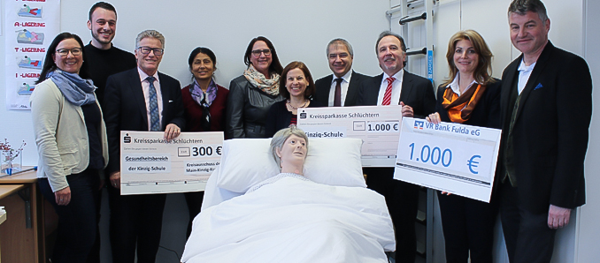 Nach dem einjährigen Umbau des neuen Gesundheitsbereichs an der Kinzig-Schule in Schlüchtern bietet die Kinzig-Schule als Berufliches Schulzentrum des Main-Kinzig-Kreises den Lernenden nun optimale und moderne Bedingungen für praxisnahen Unterricht für medizinische und pflegerische Berufe. Das unterstützen der Main-Kinzig-Kreis sowie die Kreissparkasse Schlüchtern und die VR-Bank Fulda mit einer Spende. Zur Übergabe trafen sich Kreisbeigeordneter und Schuldezernent Winfried Ottmann, Thomas Maus, Vorstandsvorsitzender der Kreissparkasse und Frank Mackenroth, Vorstand der VR-Bank Fulda, in der Bildungseinrichtung, wo Schulleiter Karsten Günder und sein Team den Gästen den umgestalteten Fachbereich für Gesundheit präsentierten. Dieser ist erstmals an einem Ort konzentriert und nicht mehr über alle Gebäude verteilt. „Wir sind überzeugt, dass der Umbau sehr gut gelungen ist, das bestätigen uns auch erste Rückmeldungen aus der Schülerschaft“, sagte Schulleiter Günder. Den Fachbereich Gesundheit besuchen etwa 300 Schülerinnen und Schüler. Insgesamt hat die Kinzig-Schule rund 1600 Lernende.