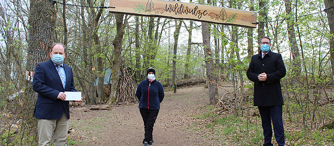 Auf einer Anhöhe im Wald von Flörsbachtal-Lohrhaupten gibt es eine Lichtung zum Spielen und Entdecken, die eigens für Kinder geschaffen worden ist: Hier bietet die im vergangenen Jahr eingerichtete Naturgruppe „Die Wildwutze“ der gemeindeeigenen Kindertagesstätte einen idealen Platz für Kinder ab drei Jahren. Landrat Thorsten Stolz überbrachte einen Zuwendungsbescheid in Höhe von 10.000 Euro an Bürgermeister Frank Soer. Das Geld stammt aus dem Kreisausgleichsstock.