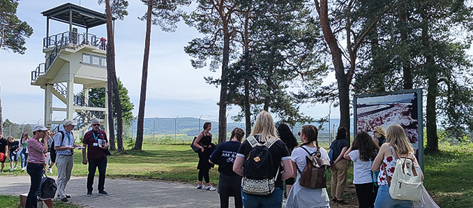 Besonders berührend war während eines Podiumsgesprächs der Bericht einer ukrainischen Stipendiatin, die von ihren Fluchterfahrungen erzählte und sich für vielfältige Unterstützung ihres Landes bedankte. Des Weiteren ging es um die Frage, welche Werte zu einer gemeinsamen Zukunft führen können. Die Notwendigkeit eines eventuellen Konsumverzichts konkretisierte der Bischof von Pilsen, Tomas Holub, mit der Frage an alle Anwesenden, wer denn bereit sei, morgens kalt zu duschen, um Energie zu sparen. Nach einem Imbiss fanden in Kleingruppen Führungen über das Gelände statt, die sich der Bedeutung des Fulda Gaps als strategischem Punkt widmeten. Von der Plattform des Wachtturms aus konnten die Jugendlichen sich einen Überblick über die früheren Grenzanlagen verschaffen.