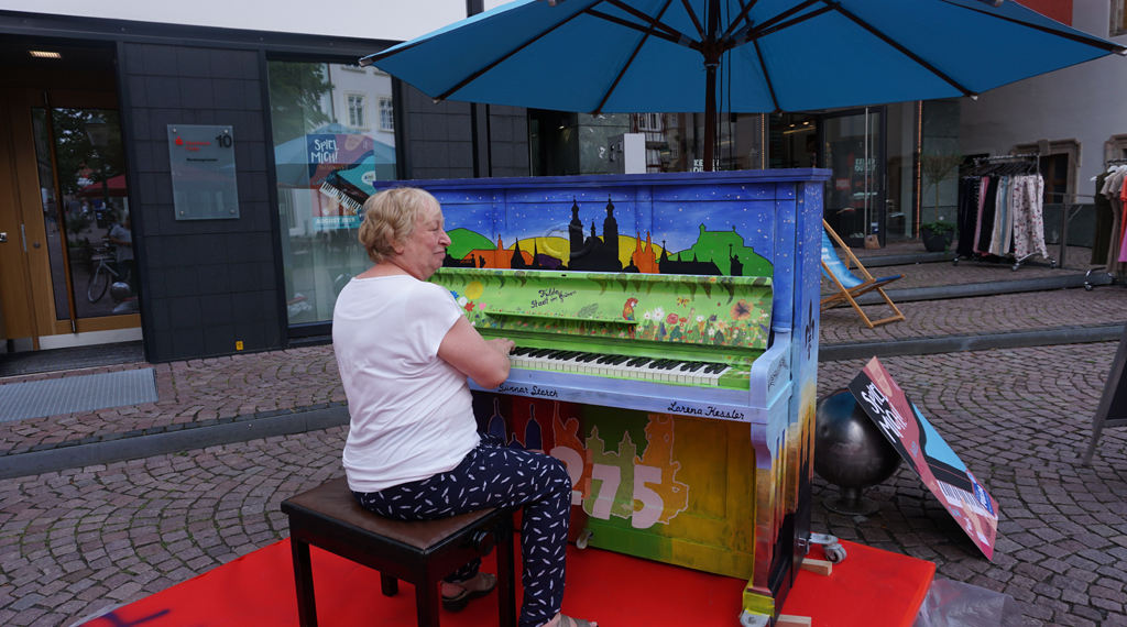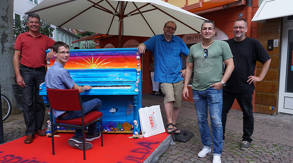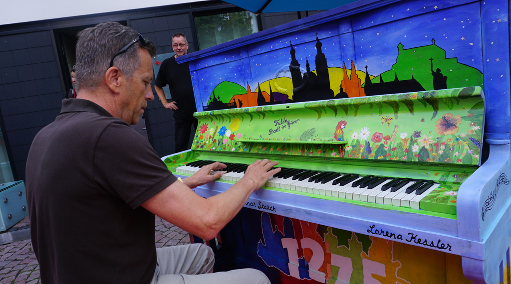 Markus Müller vom gleichnamigen Juweliergeschäft „Meister Müller“ zeigte sich gestern bei der Aufstellung der Straßenklaviere schlichtweg begeistert: Direkt vor seinem Juweliergeschäft in der Karlstraße wurde eines der drei Straßenklaviere platziert. „Was für eine schöne Idee und tolle Sache“, befand er, der Alles, was Plätze und Gassen in irgendeiner Art und Weise belebt, wichtig und gutheißt. Um die Wirkung des Klavieres auf Passanten zu testen, bat er seinen Auszubildenden, Johannes Imhof, auf dem Instrument zu spielen. Der 19-Jährige kommt aus Westerngrund bei Gelnhausen (Main-Kinzig-Kreis) und spielt dort in der „Herz-Rhythmus Bigband“. Als sich Johannes Imhoff an das Klavier setzte und anfing zu spielen, erweckte er sogleich bei Passanten das Interessiere, sodass sie stehen blieben, ihre Smartphones zückten und von seiner musikalischen Darbietung Videosequenzen drehten und diesen Moment in Bildern festhielten. Nur wenige Gehminuten von der Karlstraße entfernt, setzte sich Hans-Georg Urbin spontan an das dortig platzierte Straßenklavier und begann zu spielen... Auch hier ein magischer Effekt. Augenblicklich blieben die Passanten stehen und lauschten der musikalischen Darbietung von Hans-Georg Urbin. Hierzu noch einmal Edeltraud Maria Leib vom Fuldaer City Marketing: „Der Clou ist, Jeder und Jede soll an den Musikinstrumenten sein Bestes geben; Wenn Er oder Sie möchte, kann er oder sie diesen Moment in Bildern oder Videosequenzen festhalten und in den Sozialen Netzwerken unter ‚#spielmichfulda‘ posten.“