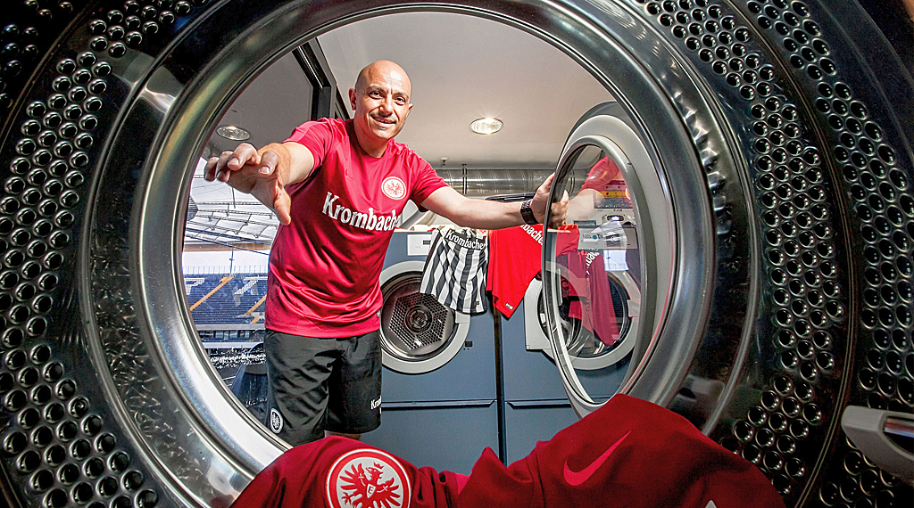 Fulda/ Frankfurt. Franco Lionti (49) ist Angestellter von Eintracht Frankfurt. Er schießt keine Ecken, Freistöße oder Elfmeter, dennoch ist er wichtiger Teil des Bundesliga- Teams. Lionti arbeitet in Block 41 der Arena und sorgt für die Spieler, dass diese sich ausnahmslos auf das runde Leder konzentrieren können. Er wäscht im Winter bis zu 10 Maschinen pro Einheit und das oftmals dreimal am Tag mit Stutzen, Hosen, Trikots, Handtücher, beflockt die Trikots, putzt Schuhe und schraubt Stollen auf. „Besonders in der Vorbereitung zur Saison, wenn im Trainingslager bis zu dreimal am Tag trainiert wird oder wenn die Eintracht zu Auswärtsspielen fährt, sind meine Kollegen und ich dafür verantwortlich, dass alles perfekt vorbereitet ist, die richtigen Stollen für jede Wetterlage aufgezogen sind und die Spieler immer im frischen, sauberen Outfit auftreten“, so der gebürtige Sizilianer.