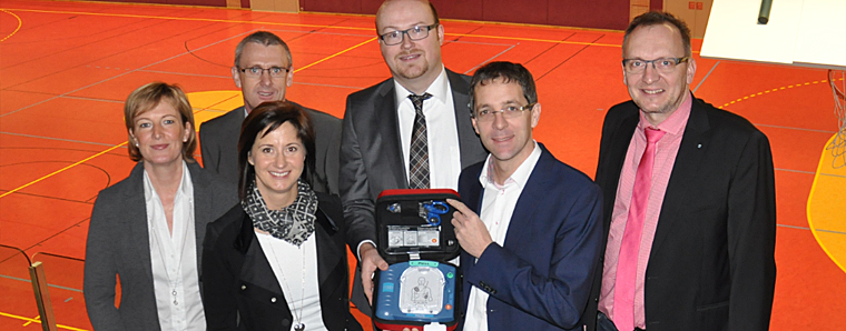 Mit solch einem tragbaren „Lebensretter“ wurde am Dienstag die Waldhessenhalle am Obersberg in Bad Hersfeld ausgerüstet. Leiter der kaufmännischen Abteilung des Bad Hersfelder Klinikums Sascha Sandow übergab gemeinsam mit Landrat Dr. Michael Koch in seiner Funktion als Aufsichtsrat des Klinikums einen solchen Defibrillator an die Schulleiterin der Gesamtschule Obersberg Kerstin Schmidt, den Schulleiter der Modellschule Obersberg Karsten Backhaus und den Schuleiter der Beruflichen Schulen Dirk Beulshausen. „Die Obersberg-Schulen sind ein guter Kooperationspartner des Klinikums. Um uns dafür erkenntlich zu zeigen, haben wir den Defibrillator beschafft und dafür gerne die Anschaffungskosten übernommen“, erklärt Sandow. Landrat Dr. Koch: „Im Fall der Fälle muss sofort gehandelt werden können. Gerade an Orten, an denen sich viele Menschen aufhalten, kann ein Defibrillator lebens- und überlebenswichtig sein. Es ist also ein kleines Gerät mit großer Wirkung!“