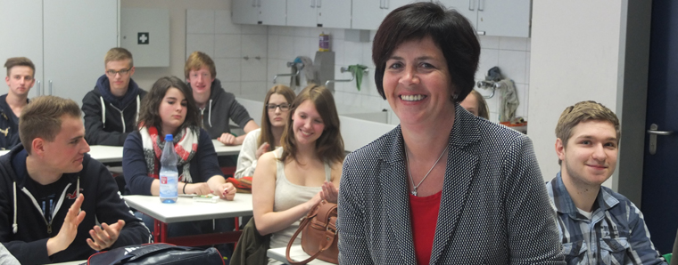 Arbeitswelt, Mindestlohn, Flüchtlingsproblematik, Griechenland, Freihandelsabkommen TTIP waren die großen Themen, die die Schülerinnen und Schüler ansprachen. Birgit Kömpel erklärte unter anderem, dass sie eine Abschaffung des „Soli“ erstmal nicht beschließen würde. Weiterhin erklärte sie, dass das Freihandelsabkommen TTIP auch die Chance biete, Standards für Arbeitnehmer global festzulegen. Sie ging aber auch auf die Risiken und die negativen Aspekte eines solchen Abkommens ein. Und bei aller Kritik sei es unmöglich, alle Griechen als faul oder korrupt zu bezeichnen. Hier verbreite ein Teil der Boulevardpresse negative Stimmung. Interessant war die Diskussion um die Politikverdrossenheit bei jungen Menschen. „Es gibt sicher Politiker, die denken, nichts für junge Leute tun zu müssen, weil die ja ohnehin nicht wählen gehen“, sagte Birgit Kömpel, die sich natürlich darüber im Klaren war, dass Powi-Abiturienten sich wohltuend von einem Gros der Jugend abheben.
