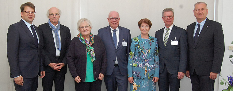 Haupt- und Ehrenamt der IHK Fulda: (v. li.) OB Dr. Heiko Wingenfeld, IHK-Hauptgeschäftsführer Stefan Schunck, die scheidende IHK-Vizepräsidentin Monika Hauß-Schmid, IHK-Ehrenpräsident Bernhard Juchheim mit Gattin Brigitte, IHK-Präsident Dr. Christian Gebhardt und Landrat Bernd Woide Foto: IHK Fulda