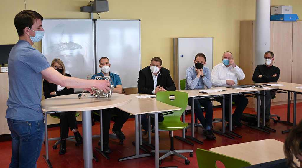Im Rahmen einer Kooperationsvereinbarung, die die Konrad-Zuse-Schule mit der Stadtverwaltung Hünfeld im Dezember geschlossen hatte, war ein Rahmen für Kooperationsprojekte abgesteckt worden, die nun wenige Monate später schon mit konkreten Projektideen gefüllt wurden. Unter der Verantwortung von Jens Heddrich von der Konrad-Zuse-Schule haben Schüler der IT-Klassen der 11. Jahrgangsstufe ihre Arbeitsergebnisse präsentiert. So haben Mitglieder eines Projektteams unter der Verantwortung von David Maul ein Simulationsmodell entwickelt, das ganz konkret am Beispiel eines Baugebietes in Michelsrombach mögliche Oberflächenwasser-Belastungen bei Starkregenereignissen simulieren kann. Ein Thema, mit dem sich das Stadtbauamt derzeit sehr intensiv auseinandersetzen muss, wie der Fachbereichsleiter Uwe Jahn bei der Vorstellung sagte. Auch der Passwortmanager, eingebaut in einen USB-Stick, könnte viele Anwendungen in der Stadtverwaltung finden, weil Mitarbeiter an wechselnden Arbeitsplätzen jeweils ihr persönliches Profil am Rechner effizient aufrufen könnten. Beeindruckend aus Sicht der Mitarbeiter war auch ein Würfel namens Cubli, der ausgestattet mit Schwungmassen und einer komplexen elektronischen Steuerung auf den Kanten balancieren kann.