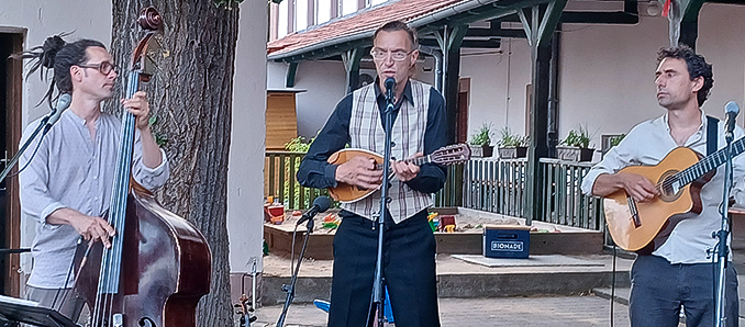 Die Interpreten Guido Richarts mit Kontrabass, Ekkehard Floß und Daniel Wirtz mit Geige, Gitarre und Mandoline, untermalten mit kräftigem Gesang die Musikstücken und schufen damit dem jeweiligen Liedgut angepasste leidenschaftliche, sehnsüchtige, witzige und mitreißende Stimmungen. Ob Jiddische oder Roma und Sinti-Stücke, ob neapolitanische Volkstänze wie die Tarantella, ob Tango aus Lateinamerika, ob Swing oder französische Salonmusik, die Zuhörer spürten die Spielleidenschaft und die Seelenverwandtschaft der Musiker und ließen sich mittragen durch Länder, Kulturen und Jahrhunderte – durch Weltmusik eben!