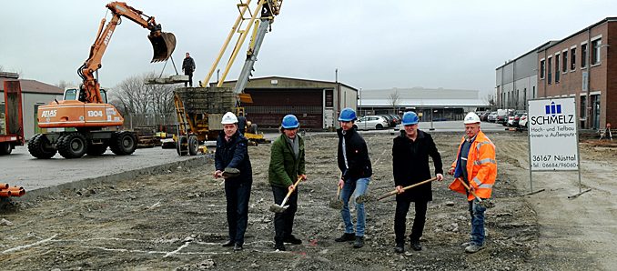 Spatenstich bei der Uth: Markus Kübchen Bauleiter Firma Schmelz Hoch + Tiefbau Peter J. Uth, Geschäftsführer Firma UTH Manuel Beßler, Projektleiter der Firma UTH Martin Reich, Reich+Kratz Architekten Norbert Plappert, Baustellenleiter von der Firma Schmelz Hoch+Tiefbau. (v.l.)