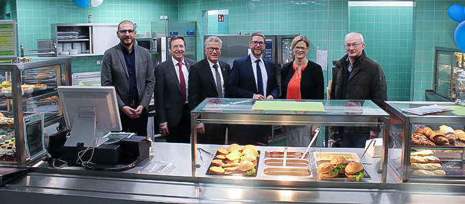 Die Zeiten kalter Küche sind vorbei: Dank einer 1,2 Millionen Euro teuren Investition des Main-Kinzig-Kreises tischen die Beruflichen Schulen in Gelnhausen ihren rund 3600 Schülerinnen und Schülern und 230 Lehrkräften nun wieder warme Gerichte auf. Zur Einweihung des neuen BSG-Bistros kamen zahlreiche Gäste, darunter auch Landrat Thorsten Stolz und Kreisbeigeordneter und Schuldezernent Winfried Ottmann. Schulleiter Hartmut Bieber informierte über die mehrmonatigen Bauarbeiten. Neben Lehrkräften und Vertretern der bauausführenden Firmen waren auch Mitarbeiter der Kreisverwaltung und Mitglieder des Kreistags gekommen, um sich das Resultat anzusehen: Ein modernes Bistro, das Einblicke in den Küchenbereich gewährt. Farbliche Akzente setzen die blau-grünen Kacheln und die bunt gestalteten Deckenpaneele. Bewirtschaftet wird das BSG-Bistro von den Heinzelmännchen, einem Tochterunternehmen des Behinderten-Werks Main-Kinzig.