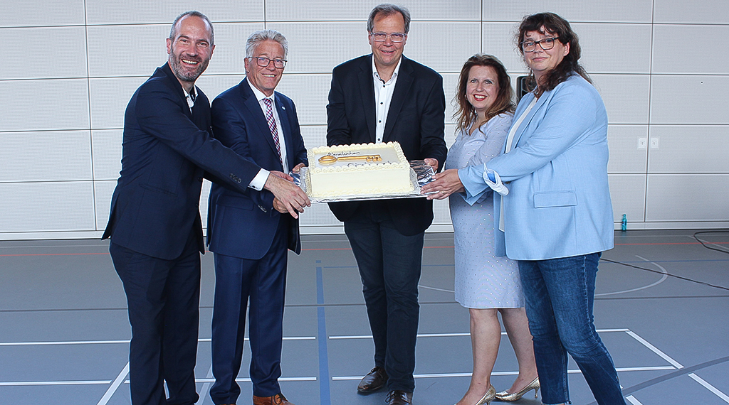 Für Bürgermeister Andreas Bär ist die finanzielle Beteiligung der Stadt Nidderau an dem Neubau eine richtige Entscheidung gewesen: „Die Verwandlung der alten Einfeldhalle in eine moderne und attraktive Zweifeldhalle ist eine wichtige Unterstützung der örtlichen Vereine. Dass die Hallenzeiten zum Start fast vollständig vergeben sind, bestätigt die Notwendigkeit und die Akzeptanz des zusätzlichen Angebots. Deshalb sehe ich mich in der Entscheidung der Stadt Nidderau bestätigt, die Vergrößerung der Halle mit einer Million Euro zu unterstützen.“ Ebenso bedeutet die neue Verkehrsanbindung über die Wonnecker Straße eine deutliche Entlastung für die Anwohner an der Jahnstraße und Am Pfaffenstein. „Insgesamt ist das Projekt eine runde Sache, für die ich dem Main-Kinzig-Kreis danke“, so Bär weiter. Als Zeichen der feierlichen Übergabe der Halle überreichte Architekt Schmitt einen Tortenschlüssel, den sich die kleinen und großen Festgäste im Anschluss schmecken ließen.